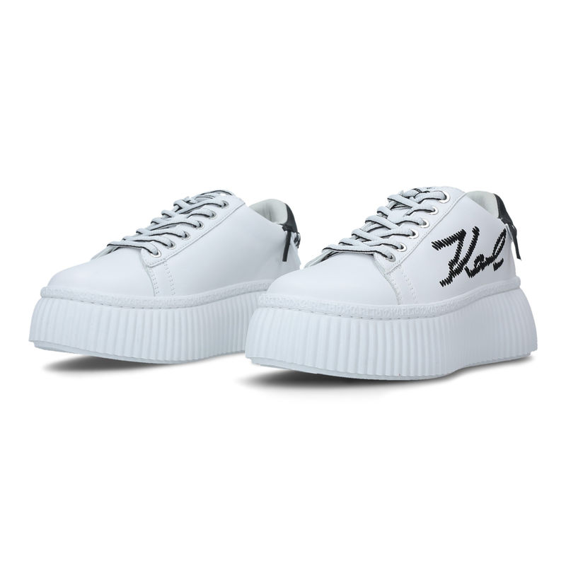 Karl Lagerfeld Kreeper Lo Whipstich Lo Lace su ženske patike sa fotografije. Ove kožne patike su u osnovi bele boje sa crnim umetkom sa zadnje strane. Znak brenda se nalazi sa bočne i sa zadnje strane. Sve je veliko i široko kod ovih patika, pa tako i masivni đon sa vertikalnim urezima. Nosite svakog dana moderne, glomazne, Karl Lagerfeld ženske patike. Ne postoji tačan podatak o tome kada je Karl Lagerfeld rođen. Njegova ekstravagantnost je išla do tih granica da se Karl pravio da slavi svoj 70. rođendan, kada je zapravio navršio 75. Ovakav slobodan duh se oseća u svim modelima Karl Lagerfeld obuće, a materijali izrade koji se koriste su neopren, koža, antilop i guma. Radi se o pronicljivoj viziji balansa klasičnog i modernog stila. Karlov lični opis su bile crne naočare, bela kosa i rukavice. Celu ponudu Karl Lagerfeld obuće pogledajte u N Fashion internet prodavnici.