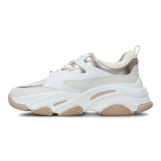 Steve Madden Progressive su ženske patike sa fotografije. Ove bež/rosegold patike imaju plitak profil i urbani dizajn. Na njima su umetci različitih oblika i boja koji odaju vibracije užurbanog života. Sa bočne strane se nalazi znak brenda Steve Madden, dok je sa zadnje strane kružni znak sa trakicom. Đon je masivan i dodaje visini. Nosite ih svakog dana. Velika jabuka - Njujork - je mesto gde je počela kultura rokenrola, a to jeste inspiracija brenda Steve Madden. Svaki komad obuće ili aksesoara Steve Madden brenda sa sobom nosi dozu elegancije, urbanosti i individualnosti. Ovo je brend koji u pozadini svira moderni rokenrol, dok pravi sigurne korake u budućnosti.