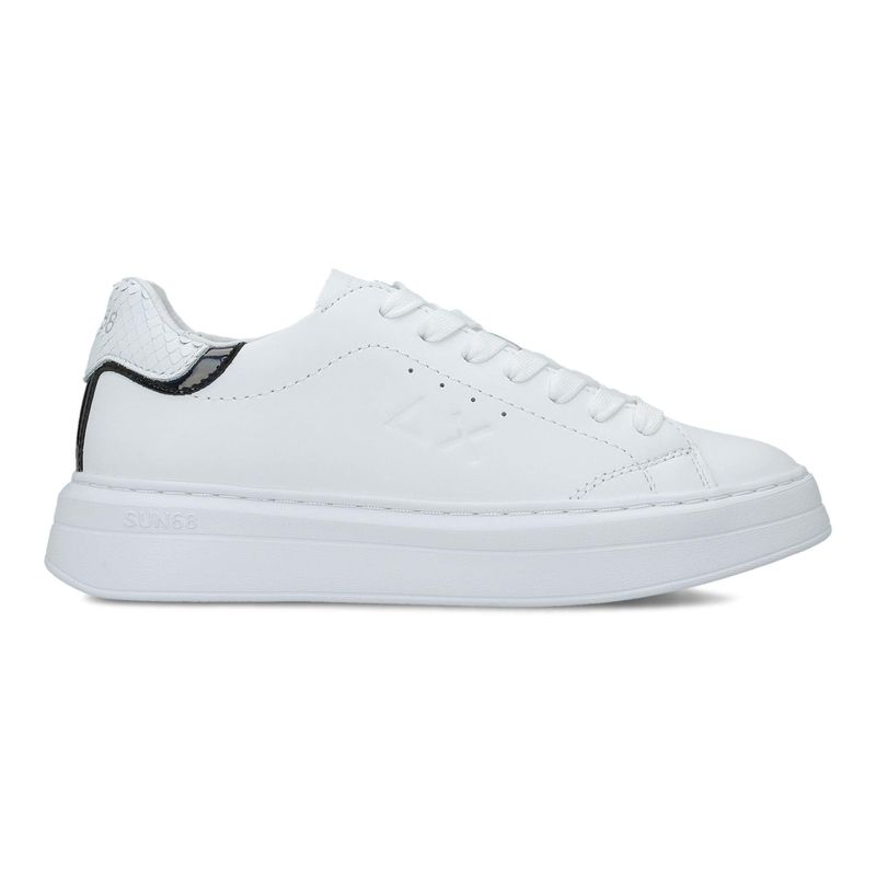 SUN68 ženske patike sa fotografije su plitkog profila. Ove bele patike imaju glatko gornjište i sa bočne strane znak brenda. Sa zadnje strane se nalazi umetak sa znakom brenda i crnom okosnicom. Đon je ravan, ali dodaje visini. Pertle mogu biti bele i crno-bele. Nosite ih svakog dana. SUN68 je italijanski brend odeće i obuće i fokusiran je na svakodnevni stil. Osnovan je 2005. godine kreiranjem polo majice inspirisane stilom 1968. godine, koja je donela popularnost. To je bio prvi korak da bi se danas bavili dizajniranjem majica, dukseva, pantalona, jakni i obuće. SUN68 logo je delta i k, odnosno konstanta i diferencijal.