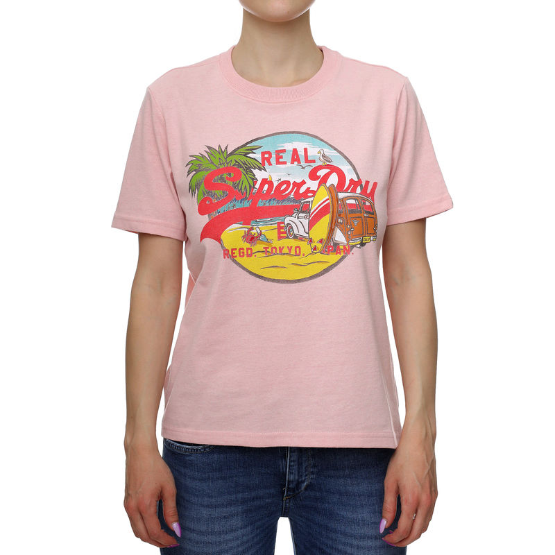 Superdry ženska majica sa fotografije je sasvim roze boje. Ima okrugli izrez oko vrata, kratke rukave i blago je strukirana. Ova majica je dugačka do pasa i na grudima ima znak brenda sa tekstom Real Superdry i grafikom plaže, mora i palmi. Nosite je svakog dana tokom leta i drugih godišnjih doba.Dvojica britanskih dizajnera odeće su napravili savremenog igrača na globalnoj utakmici modne industrije - Superdry. Oni ručno crtaju američku grafiku inspirisanu Japanom, pa tako dobijaju međunaordni pečat na svakom dizajnu. Tokio je urban grad, pun vibrantnih boja, pa shodno tome Superdry svoju pažnju poklanja mladima u dvadesetim i tridesetim godinama koji prepoznaju dobre vibracije. Superdry dobija sve veću popularnost koja će utabati put novim generacijama.