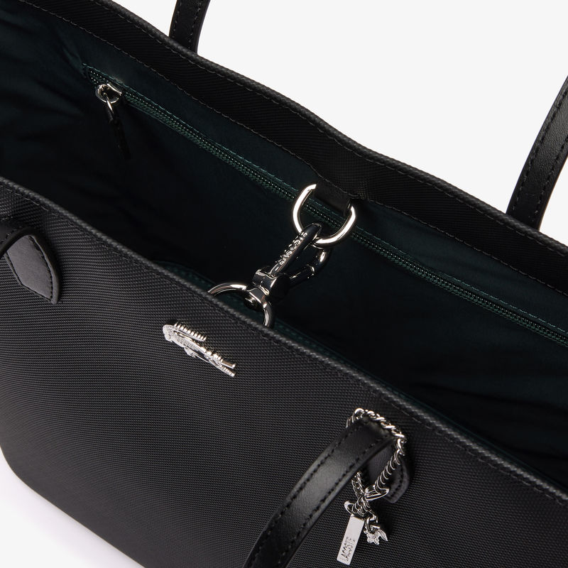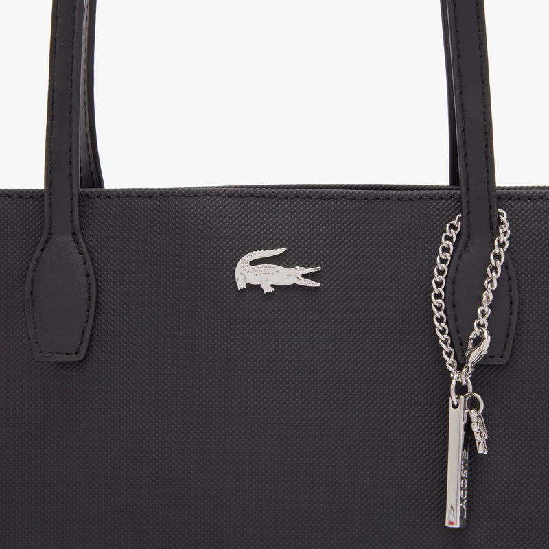 Lacoste ženska torba sa fotografije je crne boje. Ovo je velika torba, otvara se sa gornje strane. Sa prednje strane se nalazi metalik znak krokodila - znak brenda. Torba je karakteristična po tome što ima metalik lančani privezak sa spoljne strane. Najbolje se nosi preko ramena pomoću dve uže ručke.Lacoste brend nastao je davne 1933. godine, kada je popularni francuski teniser René Lacoste osnovao kompaniju. Profesionalci u ovom poslu kreiraju odeću i obuću za sve ljude koji neguju eleganciju. U proteklih nekoliko decenija, Lacoste je ojačao temelje svog brenda koristeći širok dijapazon proizvoda, od sunčanih naočara, preko aksesoara, do obuće, parfema i ručnih satova.
