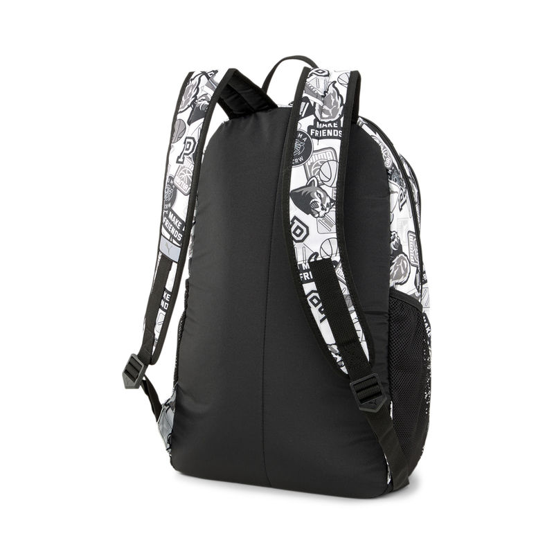 Puma Academy Backpack je beli ranac sa crnim šarama i zabavnom štampom Puma. Ima tri džepa, dva veća i jedan manji, a sa svake bočne strane ima po jedan mrežasti džep. Teret je jednako raspoređen zahvaljujući izdržljivim kaiševima za ramena. Svaki od tri džepa se otvara cibzarom i spreman je da ponese sav sadržaj koji vam je potreban.