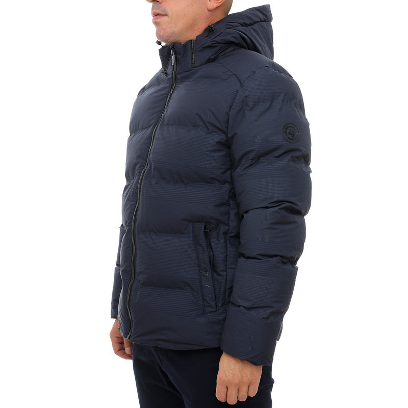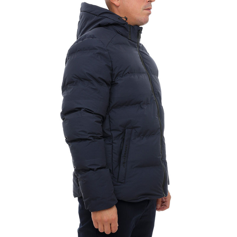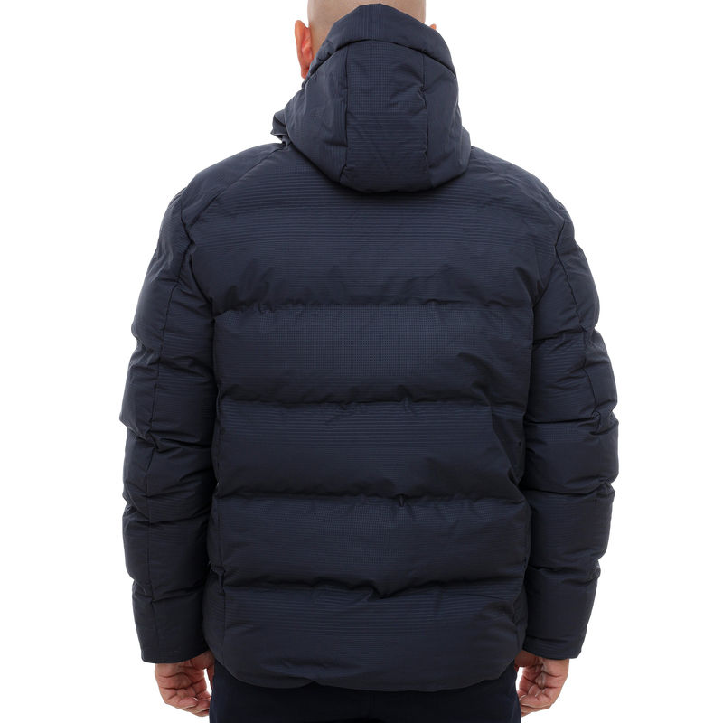Izrađena od vodootpornog poliestera u navy boji, ova jakna ima punjenje i kapuljaču. Klasičan izgled za jesen/zimu 2025.